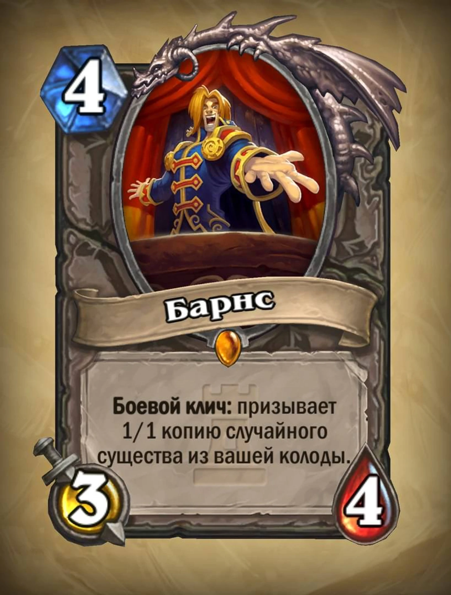 Общая эпическая карта, существо 4/4 за 6 маны. Боевой клич: «Вы показываете заклинание из колоды. Призывает случайное существо за ту же ману».
