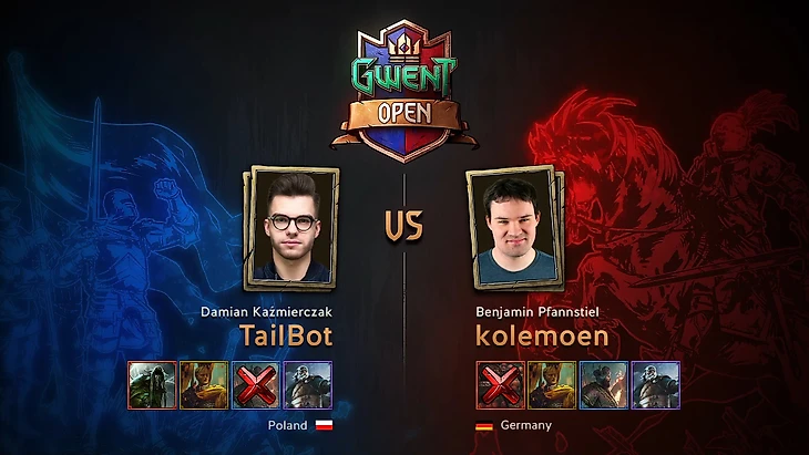 В первой партии TailBot играет за Дагона, kolemoen выбрал в лидеры Яна Кальвейта. Немец взял первый раунд, а во втором его ждала неприятность в виде уничтожения лидера. Две мертвые карты в руке (Кагыр и Плотва) сделали дальнейшую борьбу бесполезной и kolemoen сдался в третьем раунде. (1:0)