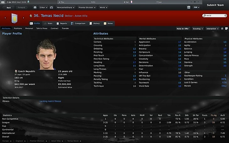 Понятно, что далеко не все игроки своего потенциала достигают – как в жизни, так и в FM. В перспективе Нецид был круче Неймара, Лукаку или Балотелли, но в отличие от них почти никогда не раскрывался полностью: Его показатели тормозились в районе 150-160 и зависели от того, в каком клубе он оказывался. Довольно часто я замечал его в английской лиге, где в различных сэйвах Нецид переходил в «Эвертон», «Вест Хэм» или даже «Челси» (Антонио Конте такой форвард бы точно пришелся по душе). С выходом обновлений баз данных Томаша порезали до более честных значений потенциала вроде 157. Его партнер по сборной Чехии Вацлав Кадлец вырастал в более сильного форварда и был даже более приемлемой покупкой – и забивал больше, и умел сыграть на нескольких позициях.