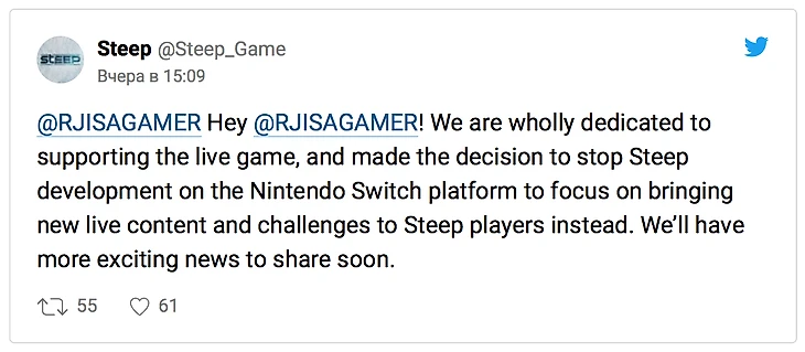 Ubisoft отменила разработку Steep для Nintendo Switch. Об этом разработчики объявили в официальном твиттере игры.
