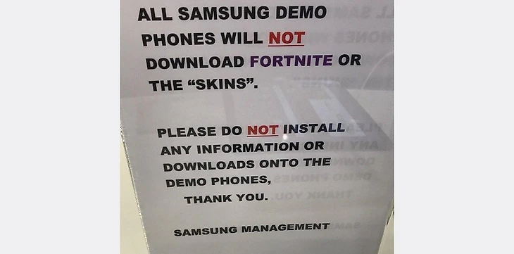 «Все стендовые версии «Самсунгов» не предназначены для скачивания Фортнайта и «скинов». Пожалуйста, не устанавливайте ничего на телефоны с витрины. Спасибо, менеджмент компании Samsung».