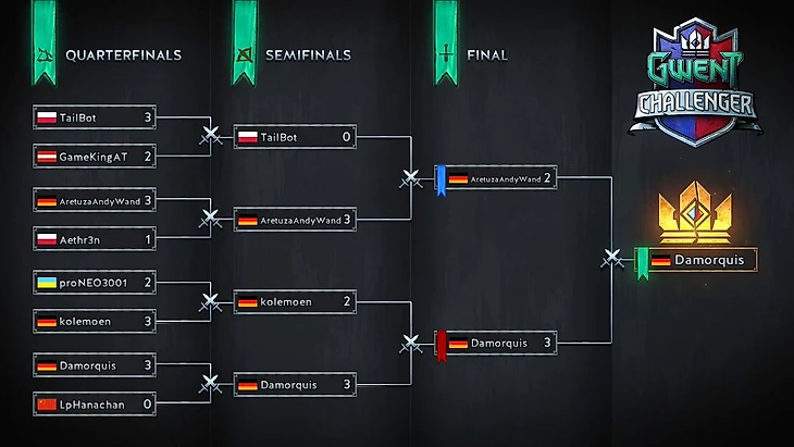 Фольтест во многом становится лидером-неудачником этого турнира, но именно в битве между двумя колодами на Фольтесте должно решиться, кто выиграет Gwent Challenger #4! Damorquis выигрывает первый раунд, AndyWand – второй. Битва в третьем раунде становится настоящим апофеозом всего турнира. Сильнее оказывается... Damorquis! (2:3)