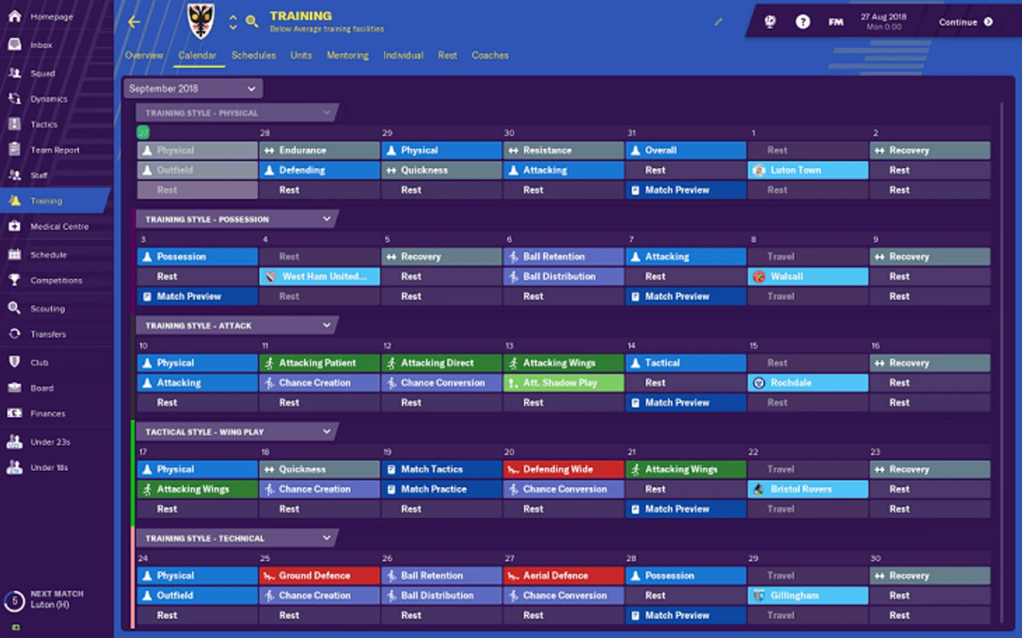 Теперь игрокам будут доступны три тренировочные сессии в день, в каждой из которых можно выбирать из десяти различных вариантов. Если раньше можно было лишь задавать общее направление тренировочного процесса, например, атака или оборона, то в FM 2019 можно будет подобрать тренировку под конкретного соперника.