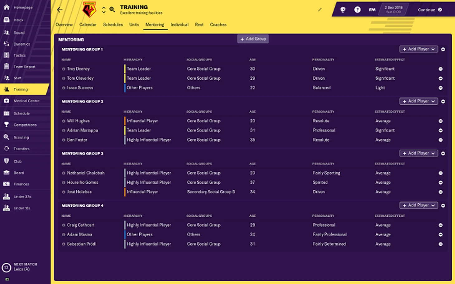 Еще одно изменение в FM 2019 – система наставников. Игроки смогут создавать группы из трех и более футболистов, один из которых будет наставником для остальных. Помимо игровых навыков, молодые игроки будут перенимать у опытных коллег и личные качества.