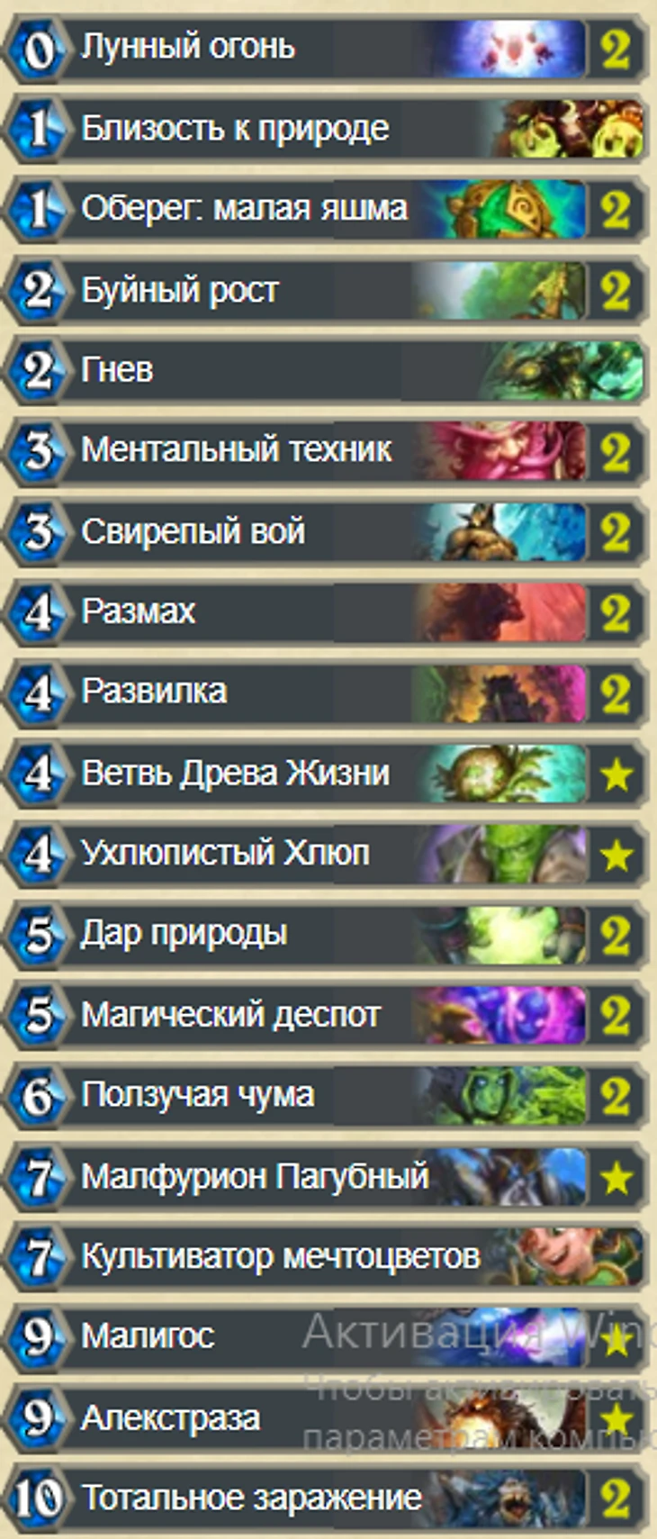 Малигос Друид – комбо-колода, которая выигрывает за счет ОТК (убийства за один ход) при использовании Малигоса, дающего +5 к урону к заклинаниям. Винкондишн колоды – быстрый разгон по мане и множество добора. 11 карт из 30 можно использовать как добор – Буйный рост х2, Гнев, Свирепый вой х2, Развилка х2, Дар природы х2 и Тотальное заражение х2. К середине или к концу игры Друид может убить оппонента с помощью с помощью «Ветви Древа Жизни», которая дает дополнительно 10 кристаллов маны, «Ухлюпистого Хлюпа», которым можно скопировать Малигоса и «Культиватора мечтоцветов», способного с вероятностью в 50-100% удешевить нужные существа.