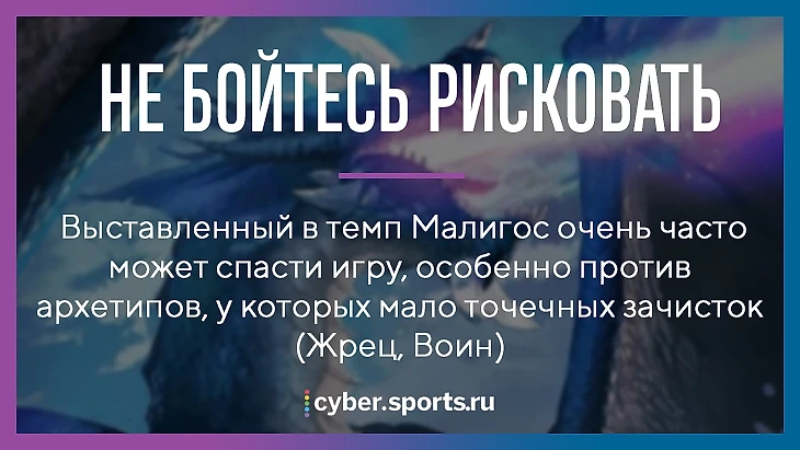 В мирроре Друидов, если чувствуете, что проигрываете по рампу или добору, рискуйте, выставляя Малигоса в темп. В игре против Баку Воина также необходимо рисковать, так как вы просто не сможете убить его через ОТК из-за огромного количества брони.
