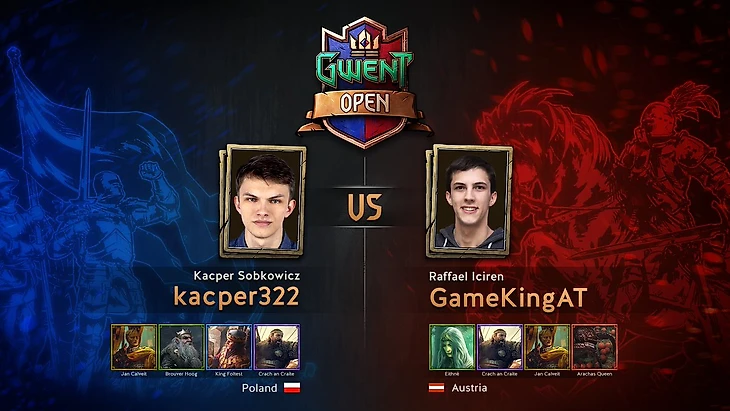 В первой партии kacper322 выбирает уже стандартную колоду Яна Кальвейта на алхимии, GameKingAT играет за Краха ан Крайта на ветеранах. GameKingAT взял первый раунд, а во втором получает неожиданный удар от поляка, который разыгрывает мандрагору на его Коралл и не дает вернуть ее в игру в дальнейшем с помощью возрождения. Kacper322 уверенно выходит в третий раунд и побеждает, несмотря на синюю монетку. (1:0)