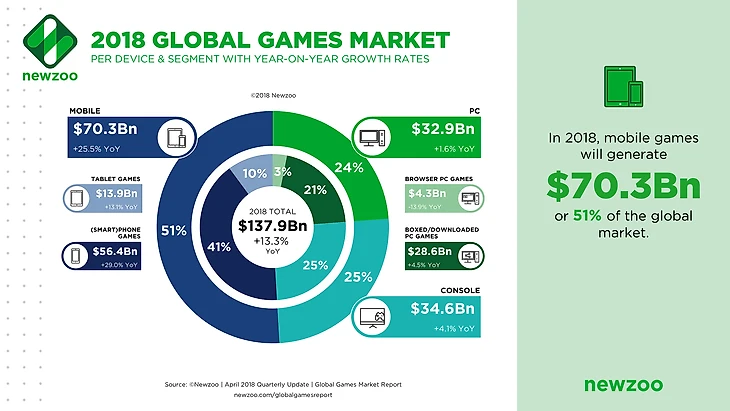 Рост мобильного сегмента продолжается. Держите цифры от Newzoo (это серьезные дяди, которые анализируют игровой и киберспортивный рынок для еще более серьезных дядь – Microsoft, Facebook, Samsung, Dreamworks, Warner Brothers и многих других) – игры на мобильных устройствах сейчас приносят больше дохода чем консоли и ПК вместе взятые.