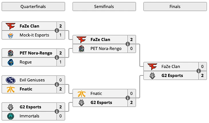 Финал Pro League Season 8 прошел по системе Single Eliminaton до двух побед. В финале G2 Esports победила Faze Clan со счетом 2:0&Призовой фонд турнира – 167 тысяч долларов. G2 Esports заработала 75 тысяч долларов, Faze Clan – 30.