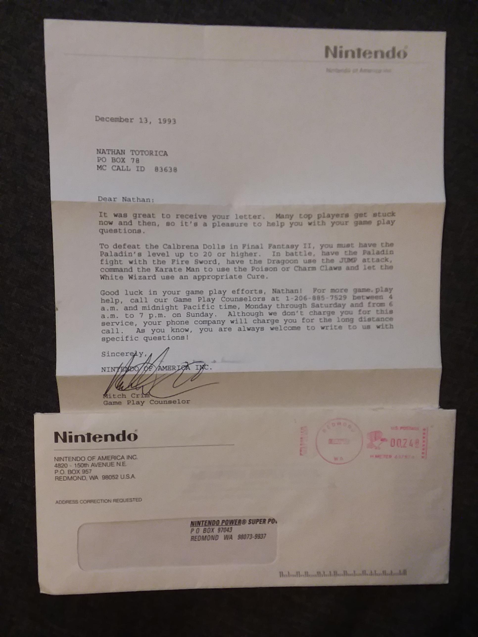 Геймер Нейтан Тоторица в 1993 году написал в Nintendo с просьбой помочь ему c боссом Final Fantasy II – Calbrena Dolls. Компания ответила ему и заверила, что даже самые лучшие игроки нередко испытывают трудности с прохождением. Игроку подробно рассказали, как пройти уровень.