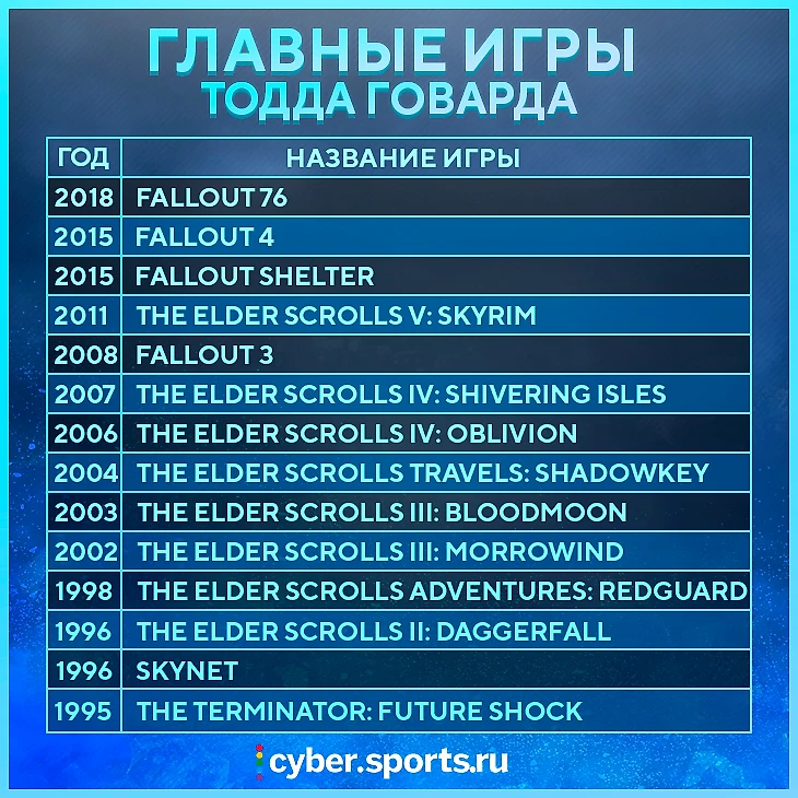 Мало кто вспомнит, что за свою карьеру он заработал массу престижных премий – в частности, пять лет подряд получал приз за лучшую игру года. Без его участия величайшие RPG Fallout и The Elder Scrolls вряд ли были бы такими, какими мы их знаем сегодня. Cyber.sports.ru вспоминает путь Тодда Говарда в игровой индустрии.