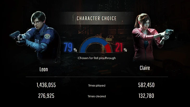 Первым персонажем геймеры выбирают неотразимого Леона Кеннеди — 79%. Молодая Клэр Редфилд довольствуется 21%.