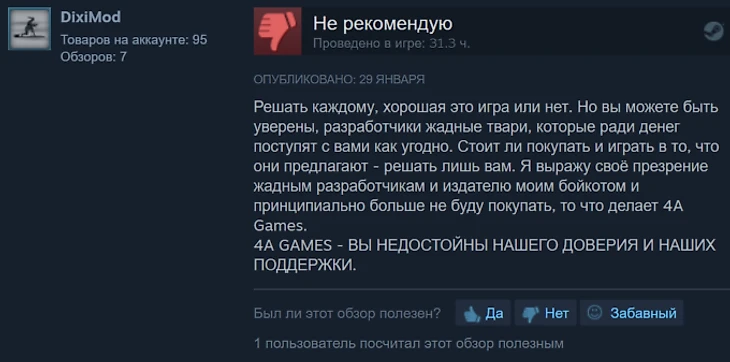 В своих обзорах геймеры подчеркивают, что поставили отрицательную оценку только из-за решения создателей игры перейти в Epic Games Store. Некоторые также напомнили, что в Metro Exodus используется система защиты Denuvo — об этом сообщили меньше чем за месяц до релиза.