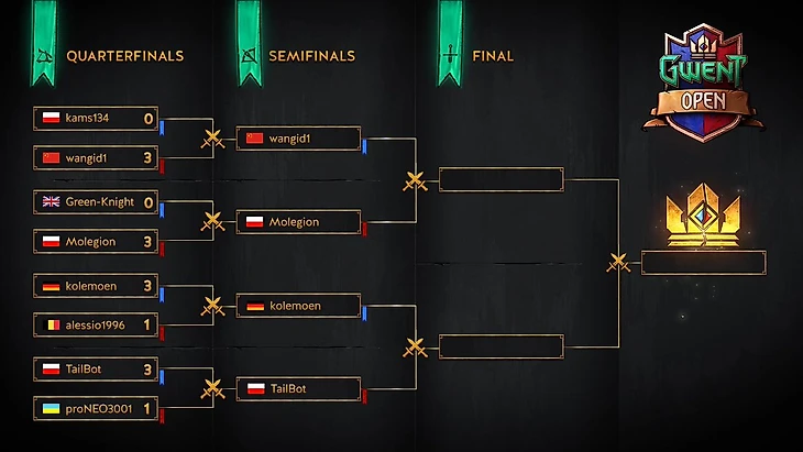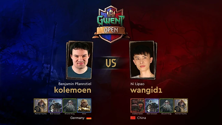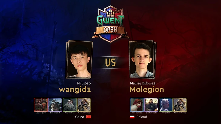 В первом полуфинале встретились впервые участвующий на официальном турнире по Гвинту Ни «wangid1» Липао (Китай) и малоопытный Мацей «Molegion» Кокоша (Польша). Впрочем, несмотря на свое не самое впечатляющее резюме, эти гвинтеры показали блестящую игру в четвертьфиналах и без особых трудностей вышли в следующую стадию. Кто из них окажется сильнее и поборется за звание чемпиона Gwent Open #8?