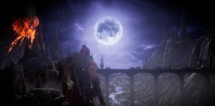 Мост, вдали которого все еще сражаются неизвестный монах и огненный воин.