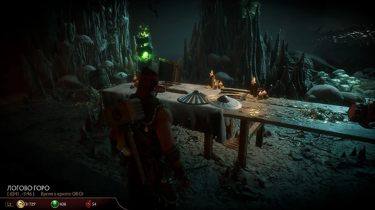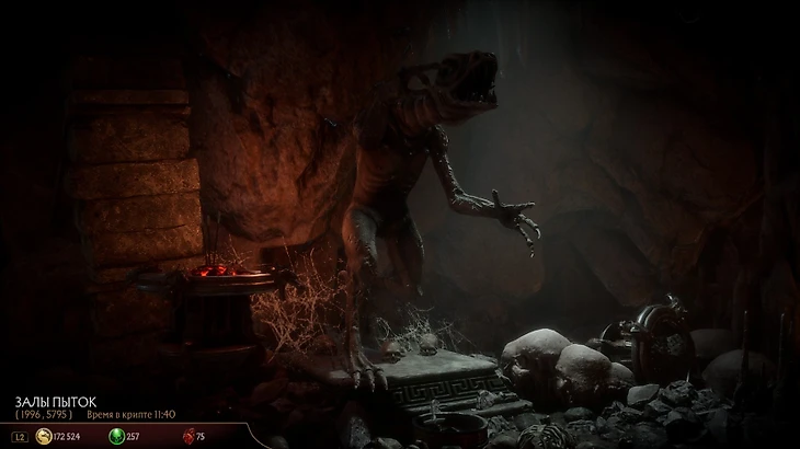 Если пройти налево от обеденного зала и сломать одну из небольших стенок в туннеле, то можно встретить и другой артефакт из фильма — статую Рептилии, на которую наткнулся Лю Кан. Если помните, то после этого воин земли начал сражаться с ящером.