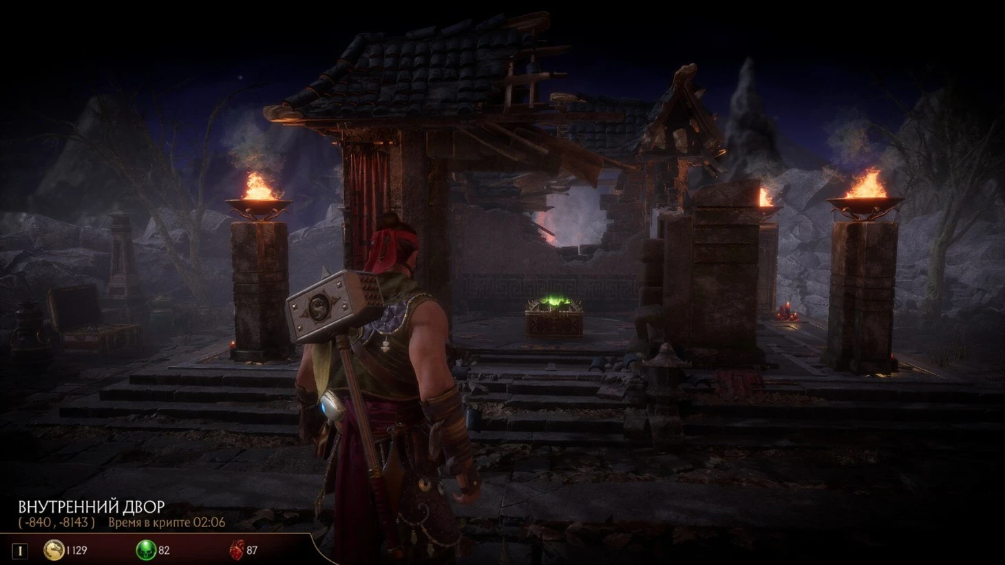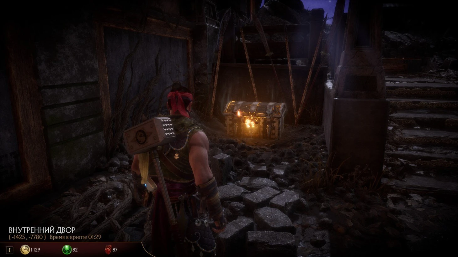 Полученный амулет активируем на статуи Рейдена на Алтаре Воинов – за это дадут его боевой посох. Он-то и является ключом к открытию Крепости Горо. Ключ-амулет дракона находится в одном из сундуков на левой платформе (прикладываю скриншот нужной области):