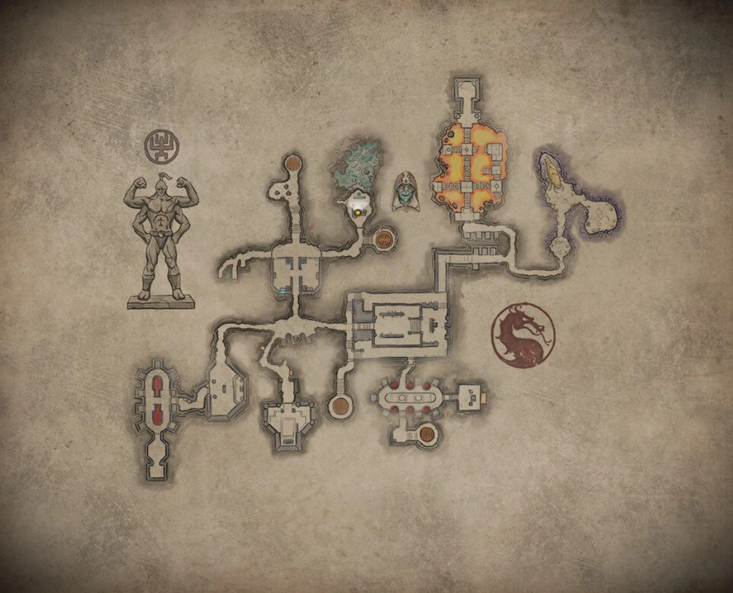 Загадка с символом Mortal Kombat. Находится на Нижнем внутреннем дворе. Самая простая из всех головоломок: вам нужно повернуть четыре фрагмента с помощью трех рычагов так, чтобы образовался символ Mortal Kombat. Решение следующее: центральный, правый, центральный, правый, центральный, центральный, левый.