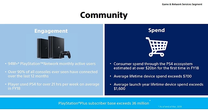 Всего в экосистемах PSN зарегистрировано больше 94 миллионов человек, 36 из которых пользуются платным сервисом PS Plus. При этом 90% всех проданных консолей хотя бы один раз выходили в сеть за последние 12 месяцев. За 2018 финансовый год пользователи экосистемы PS4 потратили 20 миллиардов долларов. А значит, в среднем каждая консоль PS4 принесла компании Sony 1600 долларов.