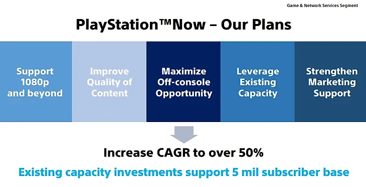 Сейчас библиотека PS Now поддерживает 780 проектов и поддерживается 170 издателями. Сам сервис запущен в 19 странах и уже привлек 700 тысяч пользователей. Функциональность сервиса поддерживает 15 дата-центров Sony. В будущем компания планирует расширить зону деятельности PS Now на весь мир и привлечь к нему более пяти миллионов пользователей. Чтобы добиться этого, Sony увеличит поддерживаемое разрешение до 1080p и выше, поднимет качество контента и передачи и увеличит затраты на маркетинг и продвижение сервиса по всему миру.