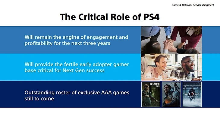 Консоль будут активно развивать на протяжении трех лет после релиза следующей PlayStation — она должна заложить фундамент для полноценного перехода на некстген. При этом Sony сообщила, что часть пользователей PS4 готова к переходу на PS5 сразу после ее релиза. На консоль текущего поколения также выйдут The Last of Us: Part 2, Death Stranding от Хидео Кодзимы и самурайский экшен Ghost of Tsushima от студии Sucker Punch (Infamous).