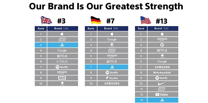 Издатель опубликовал шкалу узнаваемости и популярности бренда PlayStation в трех странах: Великобритании, Германии, и в США. В Британии бренд стоит на третьем месте, уступая только LEGO и Apple, а вот в Германии и США он на седьмом и 13 местах соответственно. Тем не менее, Sony невероятно гордится успехами PlayStation.