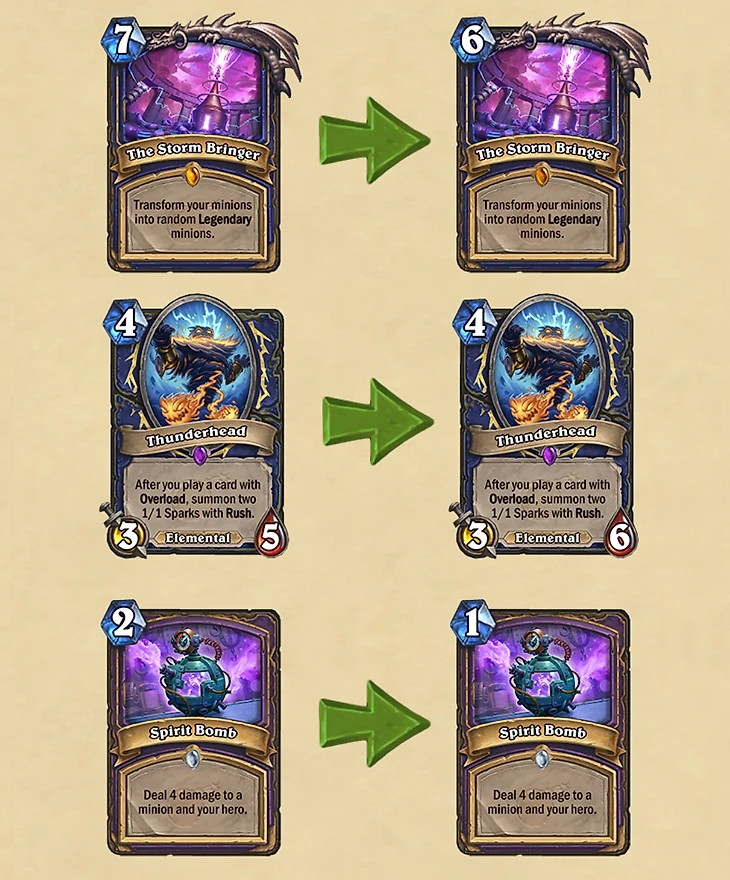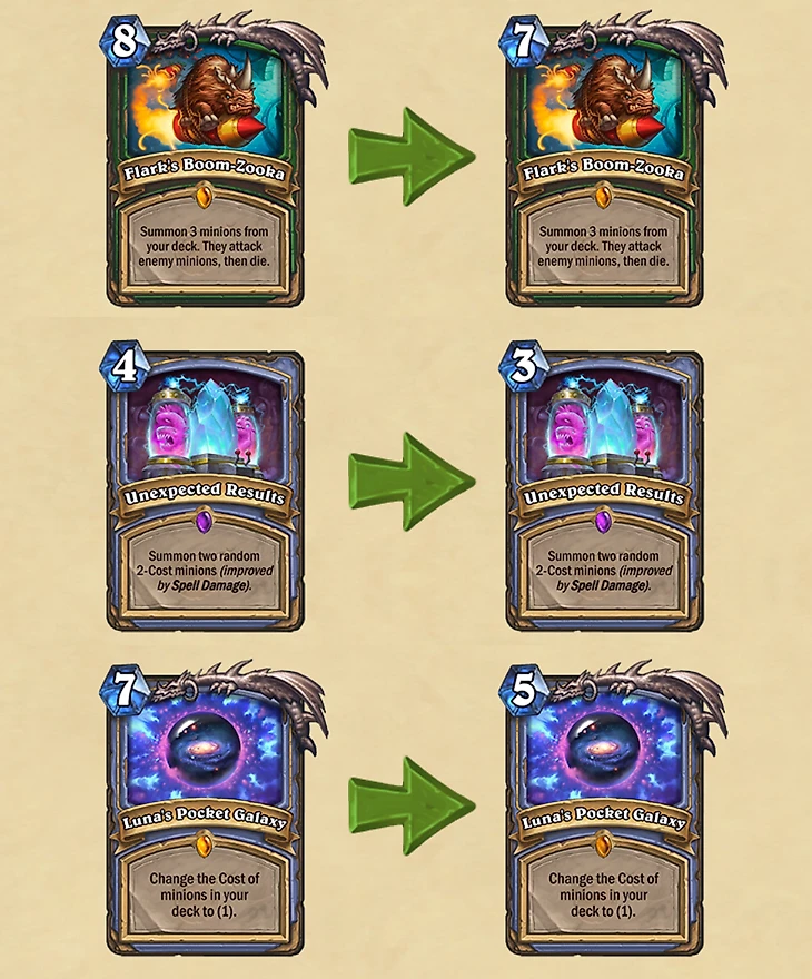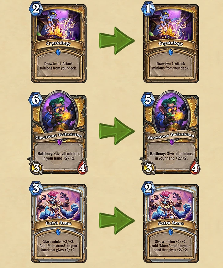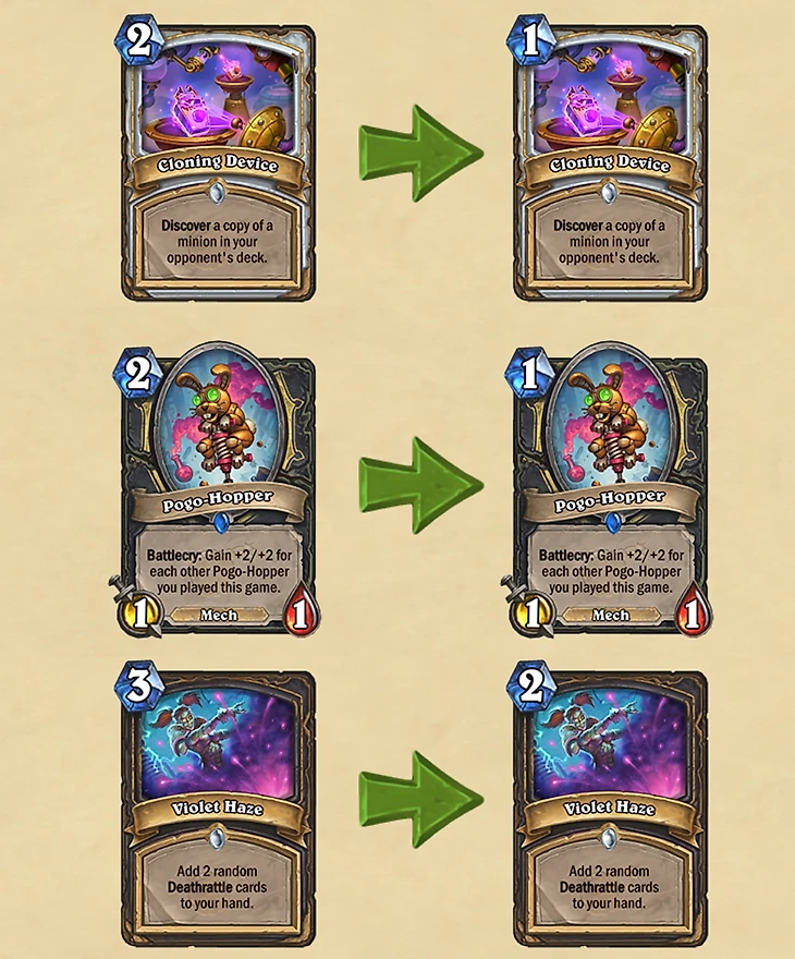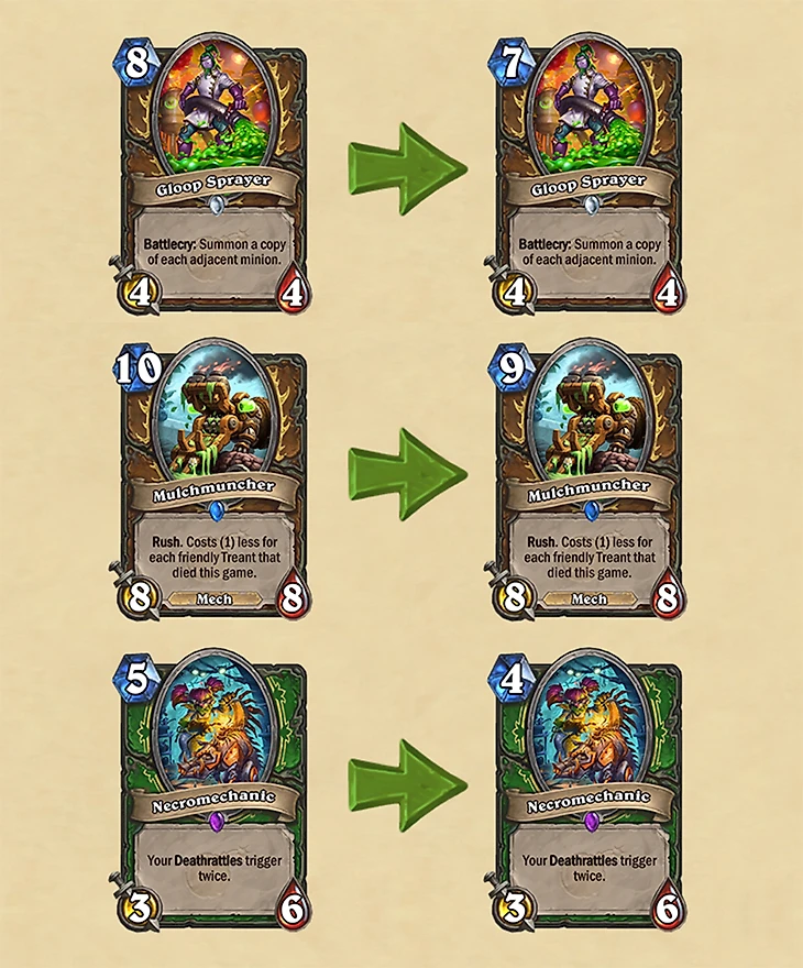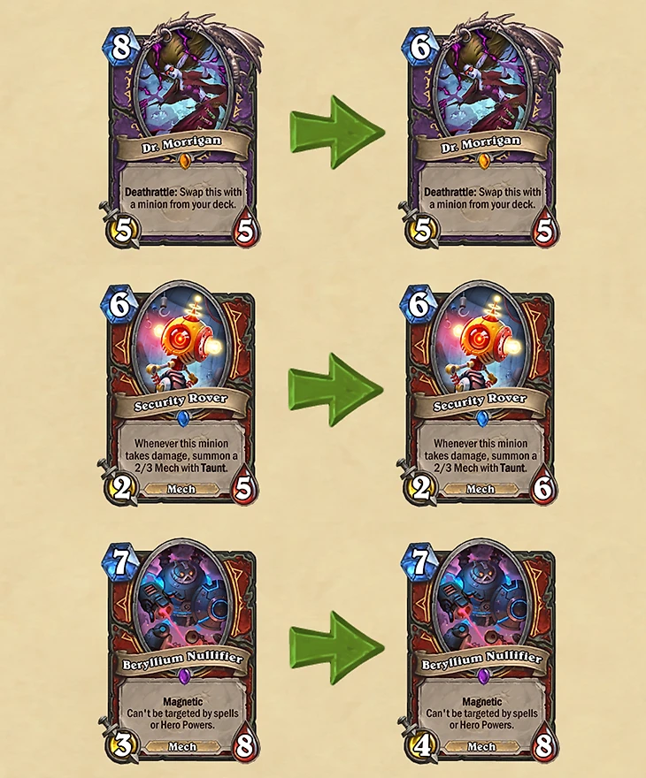 Вместе с ивентом «Восстание механизмов» Близзард впервые за пять лет усилит некоторые карты. Это очевидная попытка избавиться от однотипных колод, которая, похоже, пришла слишком поздно. Разработчики не меняли текст карт, а лишь потрогали манакосты. Что ж, довольствуемся тем, что есть.