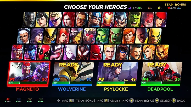 На вступительных трейлерах можно было увидеть Ника Фьюри, а после релиза разработчики выпустят целых три набора DLC с дополнительными героями: Рыцари Марвел, Фантастическая четверка и еще больше Людей Икс. У каждого героя есть своя специализация и характеристики, которые улучшаются по мере накопления уровня и после установки специальных артефактов. Более того, игра будет мотивировать комбинировать персонажей одного типа (например, Мстителей) — так можно получить различные бонусы.