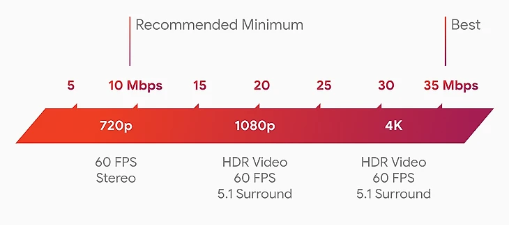 Первым делом Google показал скорость интернета, которая потребуется для комфортной игры. Для игры в 720p и 60 FPS со стереозвуком понадобится минимум 10 Мбит/с. Для 1080р HDR, 60 FPS и объемного звука 5.1 — 20 Мбит/с. Для видео с разрешением 4K, 60 FPS и 5.1 звуком потребуется скорость не ниже 35 Мбит/с.
