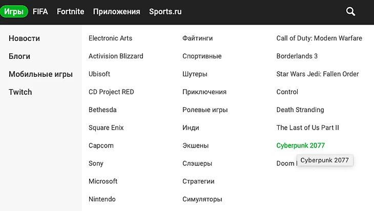 Вкладка «Игры» – тут мы выделили главные студии, жанры и ближайшие громкие релизы. С любой страницы сайта можно посмотреть последние новости Blizzard или инсайды про Cyberpunk 2077.