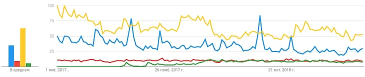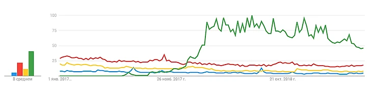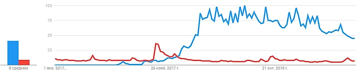 Fortnite – синий график, Call of Duty – красный. Резкий скачок запросов CoD в ноябре 2017 года связан с релизом Call of Duty: WWII.