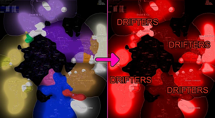 На нем показана карта зон влияния альянсов игроков в секторах с нулевой безопасностью — мест, где располагаются базы корпораций. Судя по всему, картинка указывает на планы дрифтеров целиком отобрать у игроков все звездные системы. Это можно будет приравнять к сбросу сервера — словом, сейчас в EVE Online происходит главное событие за 16 лет существования игры.
