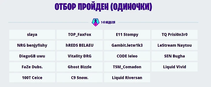 В разделе с результатами отборочных турниров на официальном сайте Epic Games у всех игроков присутствуют клантеги. Можно увидеть и Gambit.letw1k3, и FaZe.Dubs, и всех остальных.