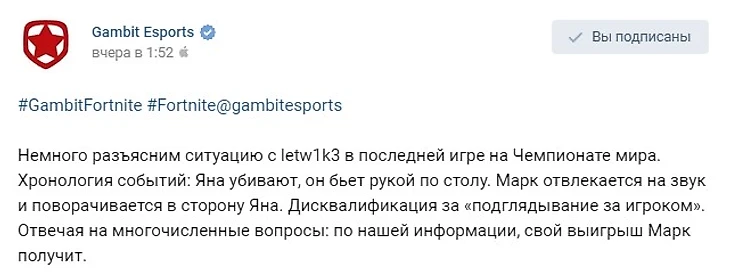 На последней карте соло-турнира Марка «letw1k3» Данилова из Gambit Esports дисквалифицировали. Организаторы якобы уличили игрока в подглядывании за оппонентами с помощью огромных экранов, развешанных на арене. Судьи предположили, что Марк посмотрел в сторону сидящего рядом игрока. По словам представителей клуба, Данилов посмотрел направо, где сидел Ян – его тиммейт.
