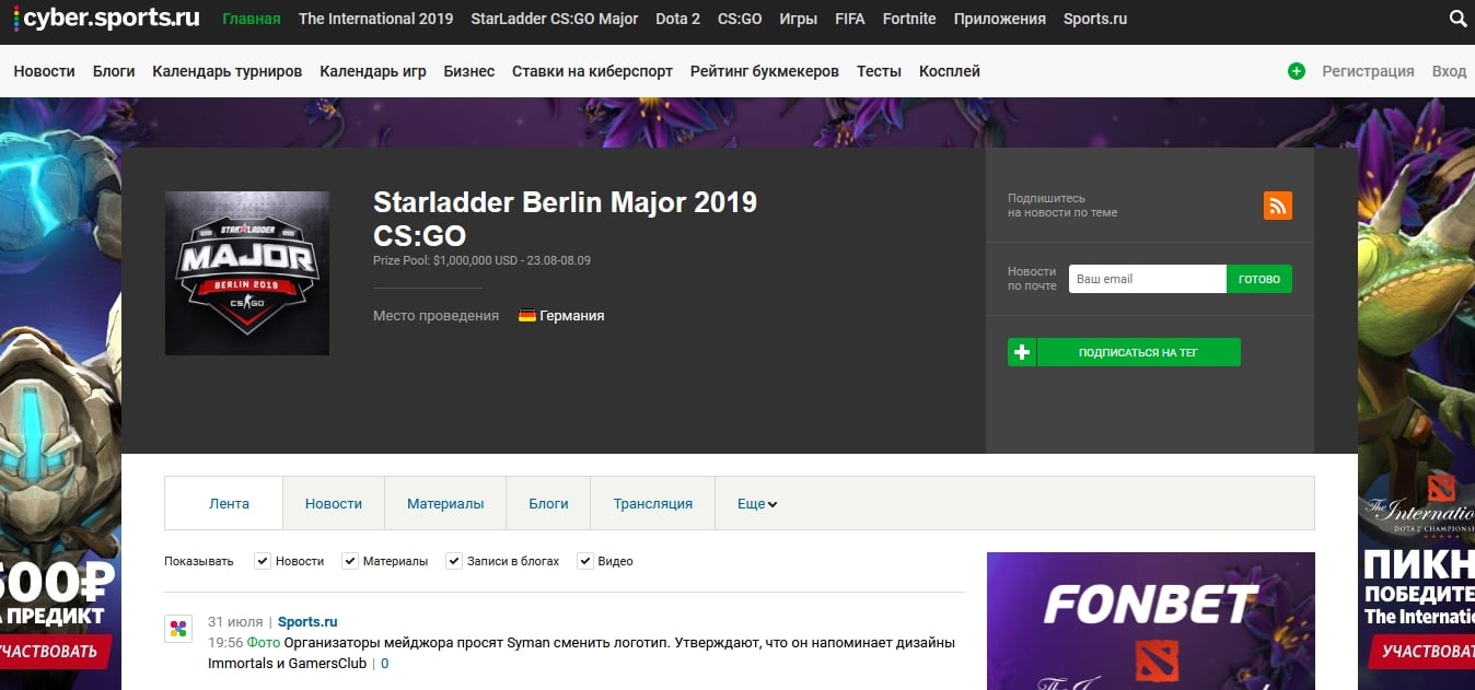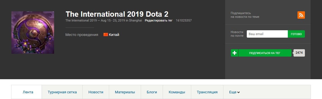 Так можно подписаться и на теги самих турниров – The International и Starladder Berlin Major. Мы изменили страницы тегов, у The International появились вкладки с турнирной сеткой (обновится после групповой стадии TI9), участниками и стримами. В скором времени такие же вкладки появятся в теге мейджора.