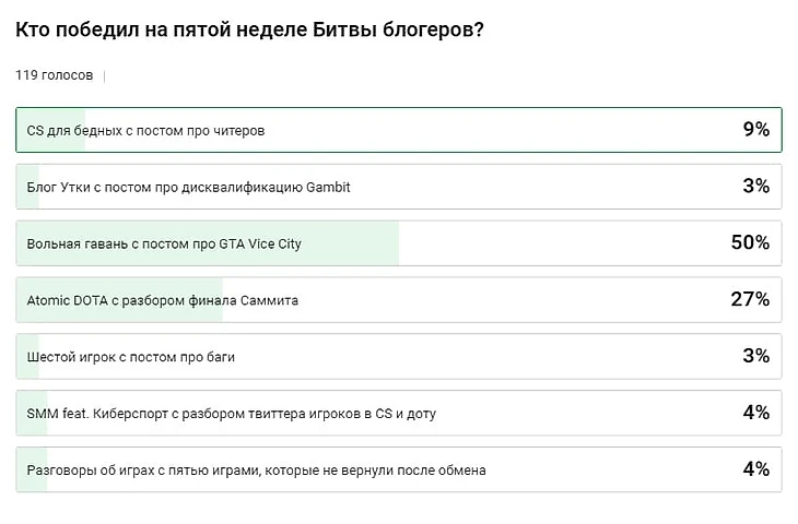 На этом Битва блогеров не заканчивается. В следующий четверг мы запустим новое голосование, в которое включим лучшие посты всех победителей недель и еще нескольких блогеров по нашему выбору. До 13:00 8 августа победители могут публиковать новые посты, чтобы улучшить свои позиции. Лидер итогового голосования получит игровой комплект, который состоит из клавиатуры HyperX Alloy FPS RGB, мыши Pulsefire Surge RGB и наушников HyperX Cloud Alpha.