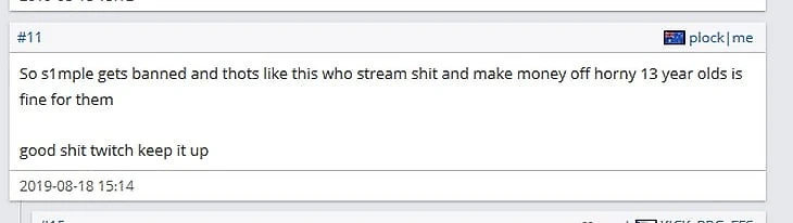 «Итак, s1mple в бане, а им можно стримить мусор, зарабатывать на перевозбудившихся 13-летках – и им это сходит с рук? Хорошо, Twitch, продолжай в том же духе».