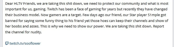 «Дорогие друзья с HLTV, мы должны избавиться от этого дерьма, мы должны защитить наше сообщество и то, что для нас важнее всего – гейминг. Долгие годы Twitch был лицом гейминга, но в последнее время они сменили свои бизнес-модель. Теперь геймеры стали мишенью. Несколько дней назад наш друг, звездный игрок S1mple получил бан за то, что пошутил над своим другом, в то время как эти легкомысленные стримерши могут показывать свои груди и задницы, не переживая за канал. Вот поэтому нам нужно высказать свое слово. Мы с этим покончим. Подавайте репорт на канал за обнаженный контент».