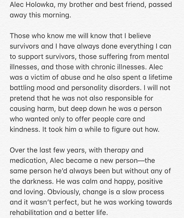 «Те, кто знакомы со мной, знают, что я верю выжившим и всегда делала все для помощи выжившим, страдающим от психических заболеваний и хронических болезней. Алек был жертвой насилия. Он всю жизнь боролся с расстройствами личности и настроения. Я не буду притворяться, будто он не нанес никому вреда, но глубоко внутри он был человеком, который хотел делиться с людьми заботой и добротой. Чтобы понять это, ему понадобилось время. За последние несколько лет с помощью терапии и лекарств Алек стал новым человеком – тем же человеком, которым он был, но без всякой тьмы. Он был спокойным и счастливым, позитивным и любящим. Очевидно, что изменения – это медленный процесс, но он работал над реабилитацией и лучшей жизнью.