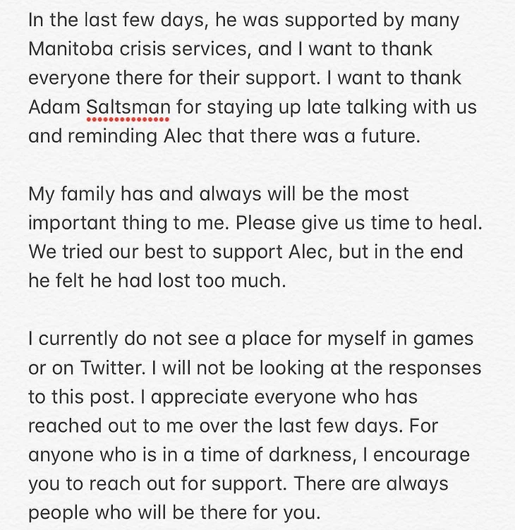 В последние дни его поддерживали различные кризисные центры Манитобы, и я хочу поблагодарить их. Также я хочу поблагодарить Адама Солтсмэна за то, что он оставался допоздна и говорил с нами, напоминая, что у Алека есть будущее. Моя семья всегда была и будет важнейшей вещью для меня. Пожалуйста, дайте нам время залечить раны. Мы пытались помочь Алеку изо всех сил, но в итоге он решил, что потерял слишком многое».