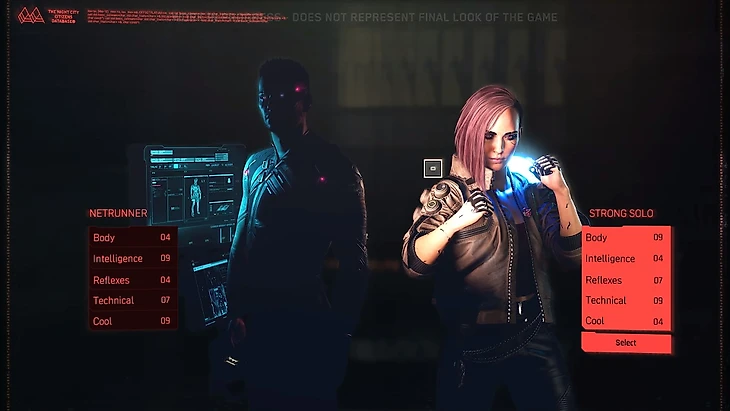 Диктор сразу напомнил зрителям, что в Cyberpunk 2077 нет четко разделенной системы классов. В зависимости от прокачки атрибутов ваш персонаж может стать кем угодно и действовать как угодно. Для примера нам показали два полностью противоположных стиля – Strong Solo и Netrunner. Первый ориентирован на грубую силу и агрессивный геймплей, а второй – на стелс и хакерство.