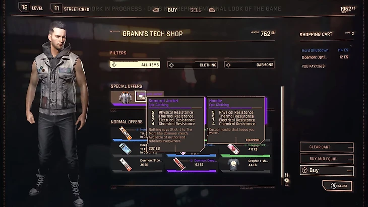 В игре будет множество вариантов, как одеть своего персонажа. При этом каждый предмет повышает персонажу определенные характеристики и обладает собственным грейдом качества. На первом скриншоте ниже можно заметить, что у Ви есть фиолетовый жакет, который дает четыре разных бонуса. Сверху – четыре фиолетовые полоски. Скорее всего, от крутости предмета зависит количество характеристик, которое он дает.
