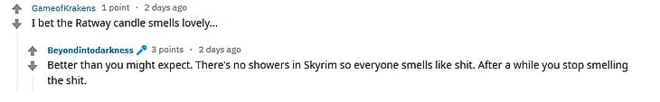 — Лучше, чем вы думаете. В Скайриме не пользуются душем, так что все пахнут как дерьмо. Через какое-то время вы перестаете чувствовать дерьмо.