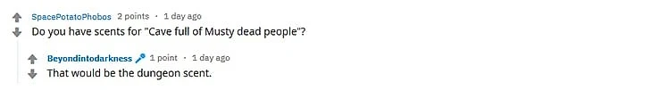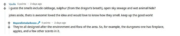 — Полагаю, среди запахов есть капуста, сульфур (из драконьего дыхания), канализационная вода и мокрая шкура животного? Кроме шуток, это круто! Очень понравилась идея и хотелось бы понюхать их. Продолжайте в том же духе!