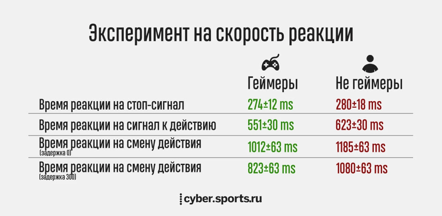 Во всех экспериментах игроки в шутеры показали более высокую скорость реакции. В случае звукового эксперимента их средние результаты оказались на 10-20% выше чем у участников, не увлекающихся играми.