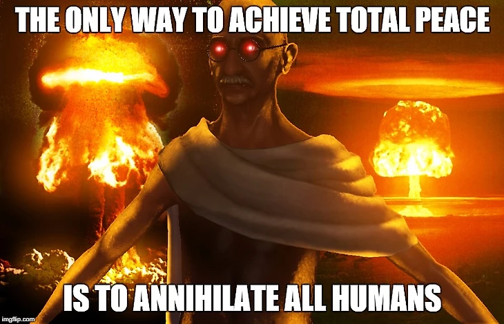Махатма Ганди – один из полководцев в первой Civilization. Тогда у каждого из десяти ключевых персонажей была своя собственная шкала агрессии, или «Шкала угрозы», от 1 до 10. Самым агрессивным полководцем считался тот, чьи показатели близки к 10; у Сталина, например, было 5 единиц, а у Ганди уровень угрозы был 1 – именно поэтому с ним происходил забавный баг. Когда лидер ставил себе модификатор «Демократия», уровень его угрозы падал на 2 балла, и поскольку у Ганди был 1 бал, его показатель падал на -1, а игра сходила с ума и переделывала цифру в 255. То есть уровень агрессии Ганди становился настолько большим, что у его ИИ буквально ехала крыша и он запускал ядерные ракеты налево и направо.