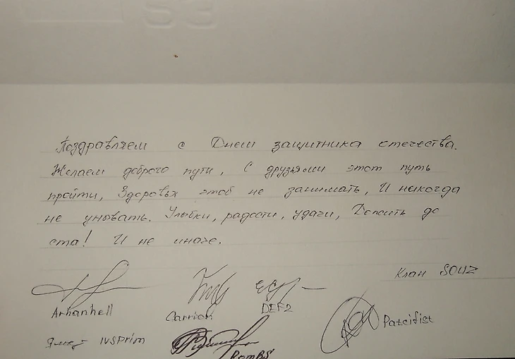 Со второй посылкой, собранной уже силами всего клана, Виктор получил подписанную товарищами открытку, которую бережно хранит до сих пор:
