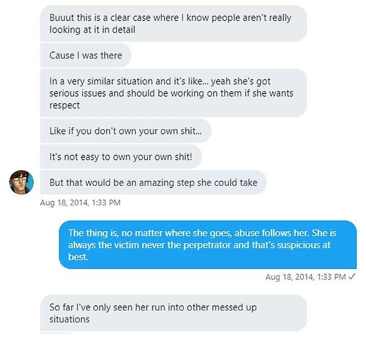 Если вы пропустили события последних недель, вот их краткий пересказ. 27 августа одна из ключевых фигур Геймергейта Зои Куинн публично рассказала о том, что Алек Холовка месяц удерживал ее в своем доме, изолировал от друзей, вторгался в работу над игрой и насиловал. Спустя два дня после публикации ее истории Холовку уволили с проекта, над которым он работал, а на следующий день его родная сестра объявила, что он умер. По формулировке публичного письма сестры складывается впечатление, что Холовка покончил с собой. Зои Куинн на какое-то время удалила аккаунт в твиттере, а позже вернула, сделав приватным.