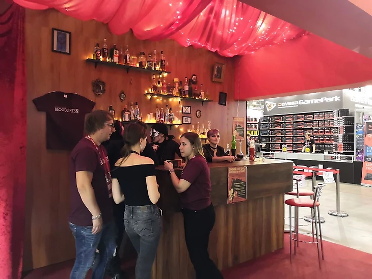 Презентация «Вампиров» получилась неоднозначной. «Бука» построила для игры самый атмосферный стенд выставки: посетители могут выпить «кровь» (томатный, клюквенный или вишневый сок) в антуражном баре, проверить свою человечность (взглянув в большое зеркало), сделать тематический бодиарт и попросить у очень правдоподобных вампиров билет на показ. Он проходит в не менее стильном кинозале, оформленным под здание из вампирского Сиэттла.