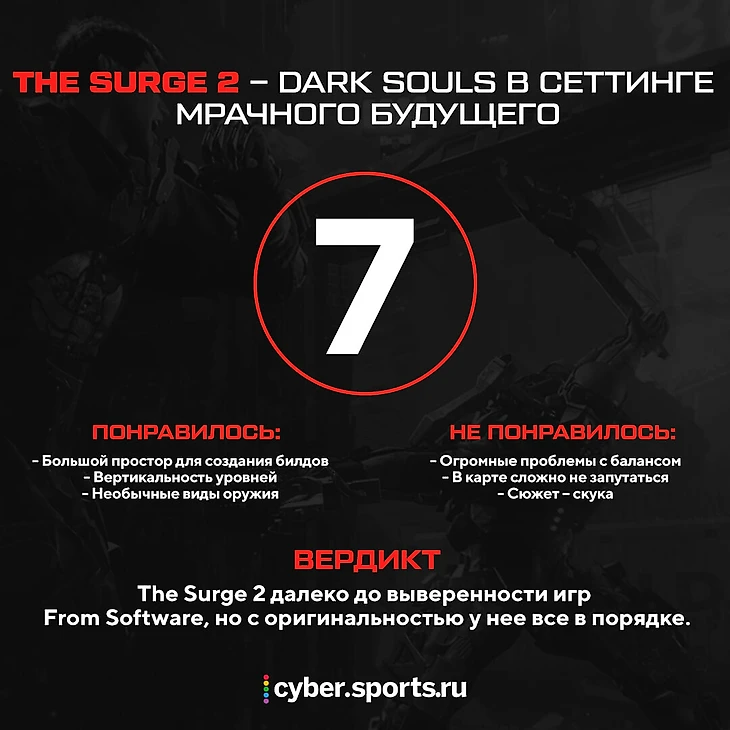 The Surge 2 так и не запала мне в душу, но и ненавидеть ее откровенно не за что. Все-таки это единственный известный мне souls-like такого масштаба в сай-фай сеттинге, да и сиквел привносит достаточно инноваций, чтобы не быть просто «клоном Dark Souls». Насколько хорошо ее уникальные идеи работают в текущей реализации – другой вопрос. Но прогресс в сравнении с оригиналом ощутим.